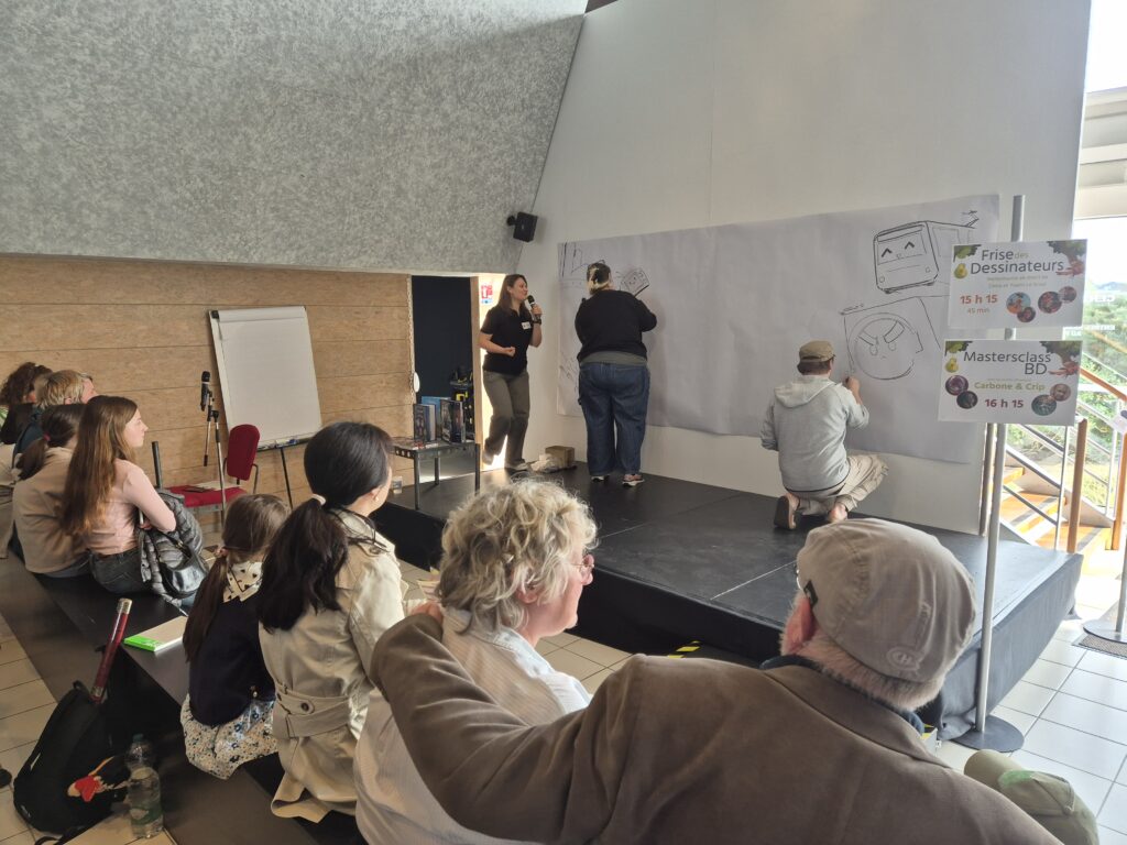 mais j’étais en bon emplacement, dans le hall, proche d’une scène sur laquelle des Quizz, remises et autres présentations ont pris vie, sous mes yeux, sous la houlette de Loïc (chargé de projet du Festival) et de Violaine (responsable de la Médiathèque). Ils ont su attrapé le micro, le temps de leur séquence et c’était vraiment sympa ! Violaine a invité 2 artistes à dessiner sur une fresque géante, avec pour thématique les grandes « inventions »… ce fût vraiment des supers moments, j’ai adoré !